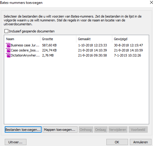 - Selecteer een of meer bestanden om deze toe te voegen aan de nummeringslijst. Je kunt ook een map selecteren. Kies Inclusief geopende bestanden als je ook alle bestanden wilt opnemen die op dit moment zijn geopend in het programma.